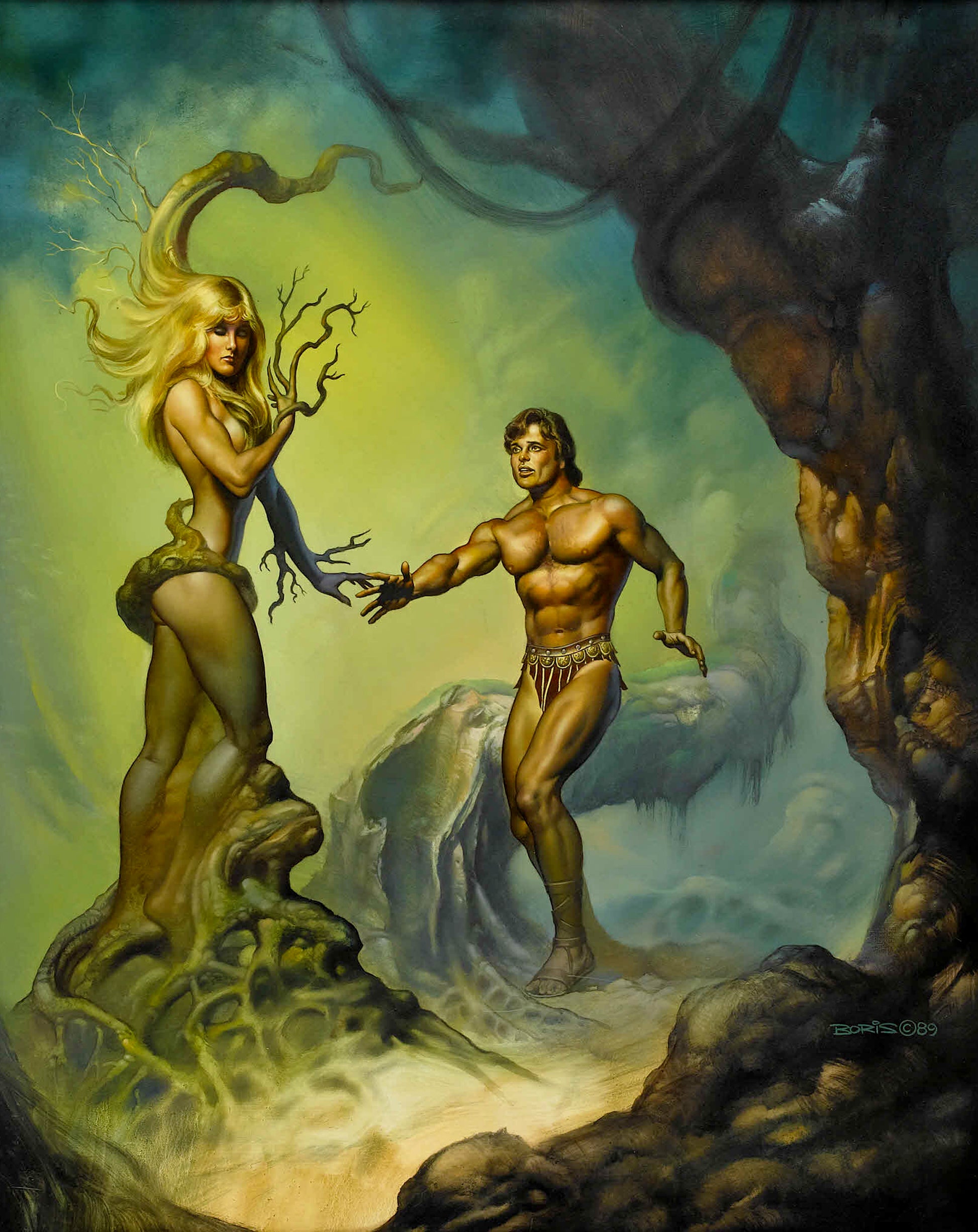 Keywords: Boris Vallejo poster, Daphne and Apollo print, Greek mythology fantasy art, 1989 Boris Vallejo painting, tree nymph transformation, romantic fantasy illustration, mythological lovers art, pulp-style fantasy decor, sensual fantasy wall art, classical story poster, fantasy lovers print, forest magic artwork, escape and metamorphosis art, surreal fantasy romance, epic fantasy mythology