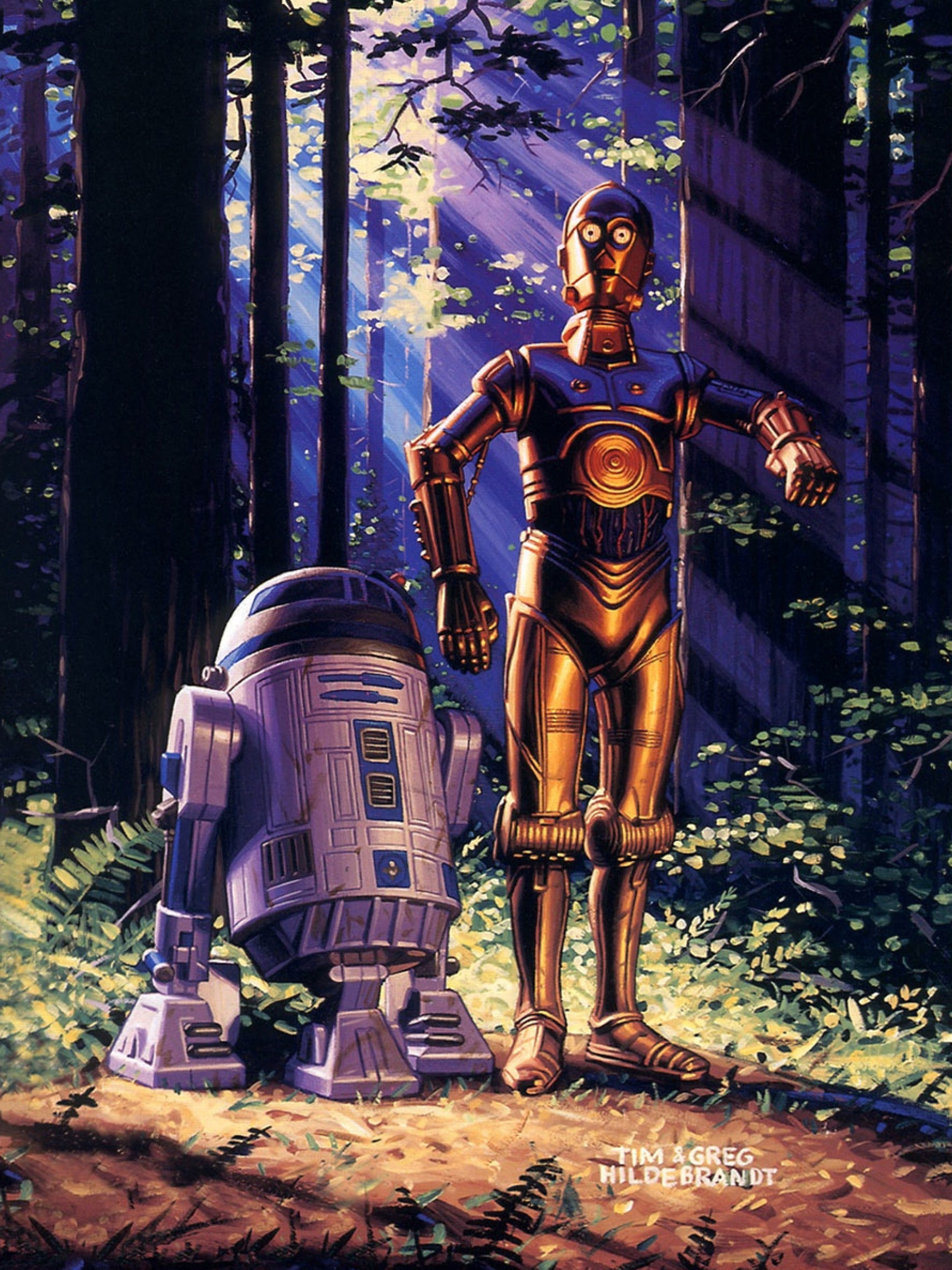 Keywords: Star Wars poster, C-3PO R2-D2 art print, Hildebrandt brothers Star Wars, Greg and Tim Hildebrandt, droid duo illustration, forest of Endor scene, classic Star Wars wall art, vintage sci-fi poster, cinematic fan art, Star Wars droids, R2-D2 print, C-3PO artwork, Star Wars Endor poster, pop culture decor, fantasy artist duo.