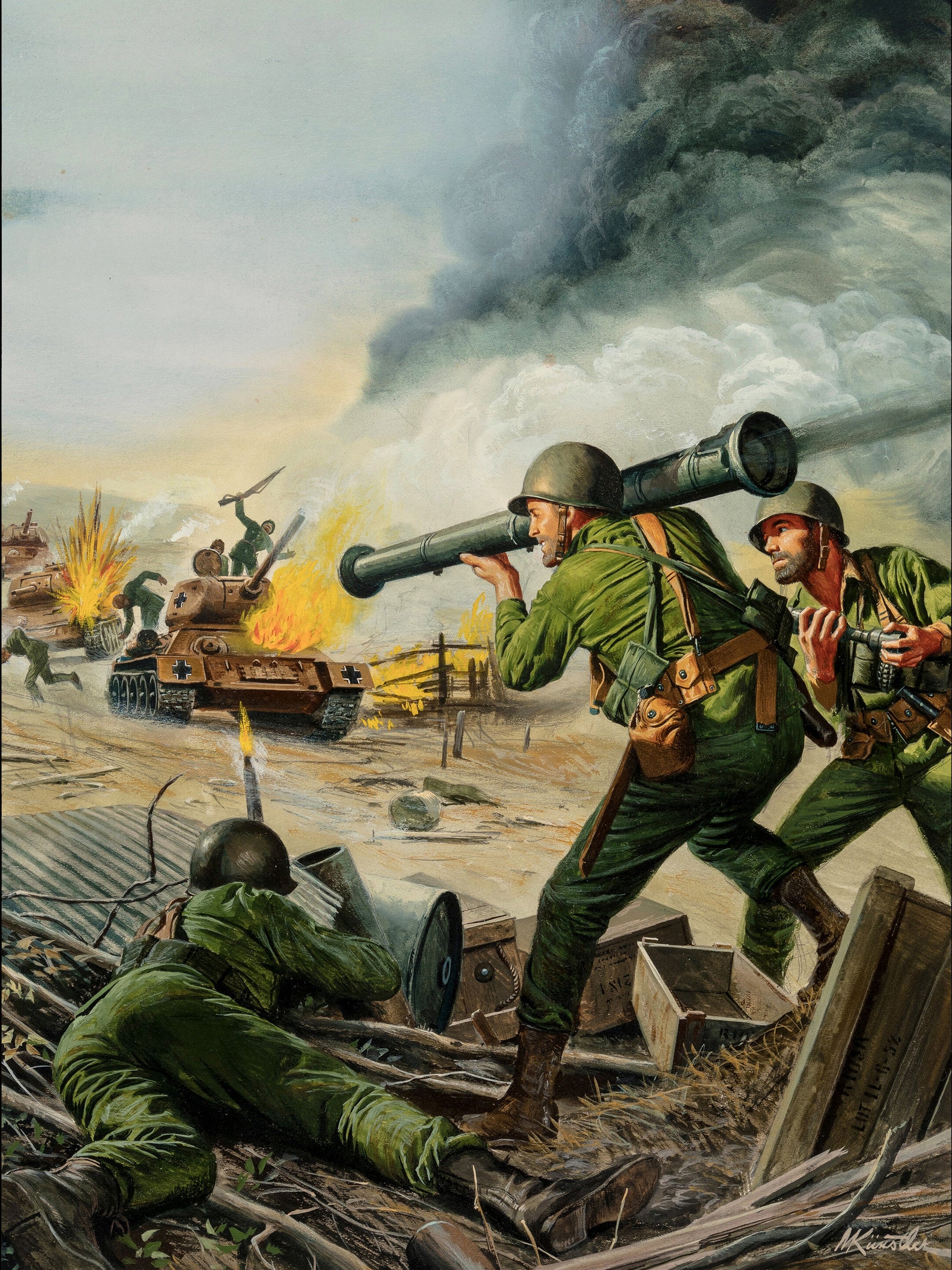 Keywords: mort künstler poster, world war 2 art, bazooka team illustration, vintage war print, military action art, nazi tank battle, 1960s pulp painting, american infantry artwork, anti-tank combat scene, stormy war backdrop, historical warfare poster, dramatic army print, explosive battlefield art, ww2 home decor, collector military print