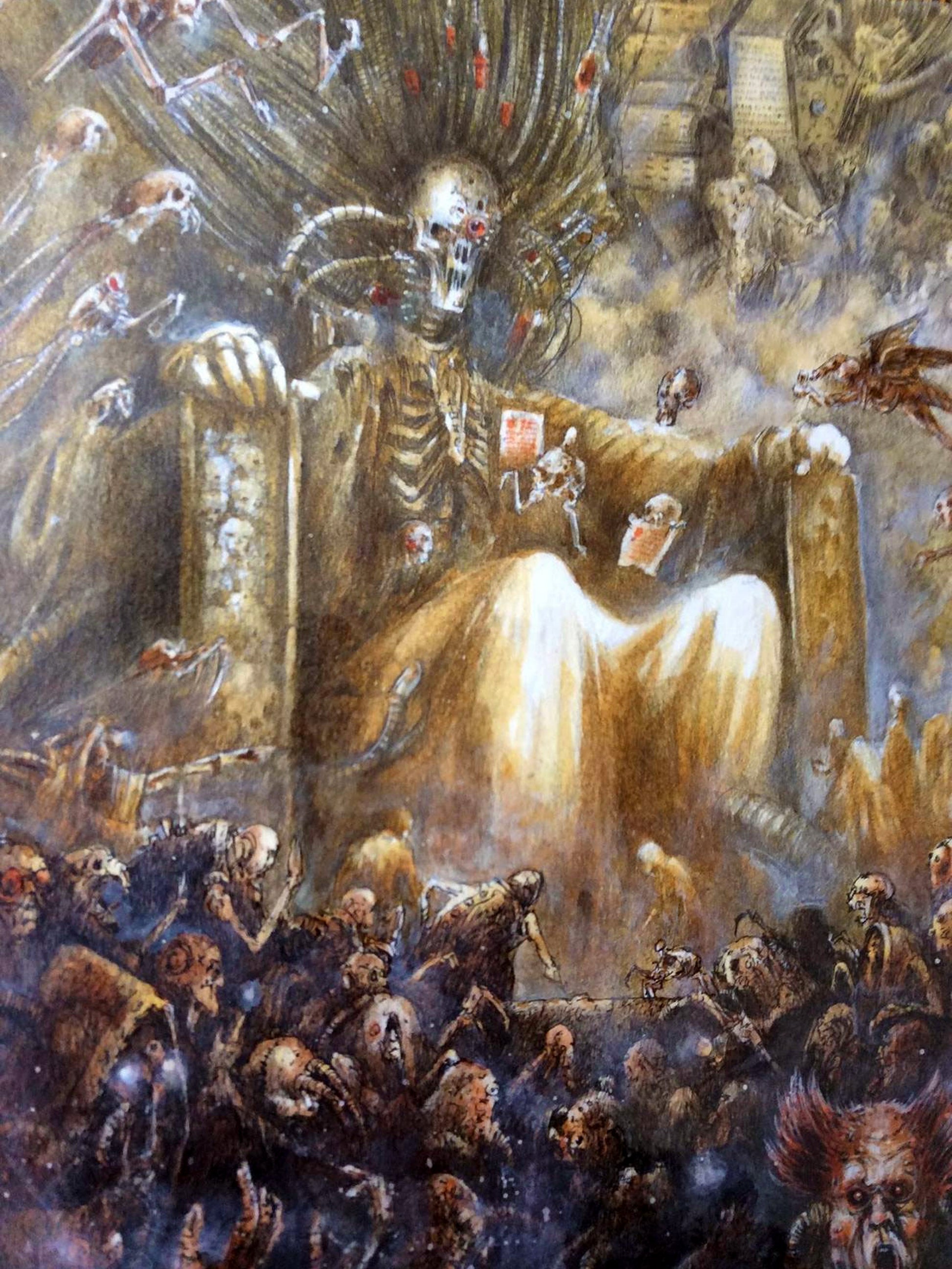 Witness the macabre majesty of the God-Emperor as only John Blanche can envision—decaying, divine, and enthroned in eternal torment. Swarming with servitors and drenched in gothic dread, this infamous Warhammer 40K artwork radiates the haunted power of the Imperium’s golden corpse-king. A deeply atmospheric tribute to the grimdark heart of the 41st millennium.